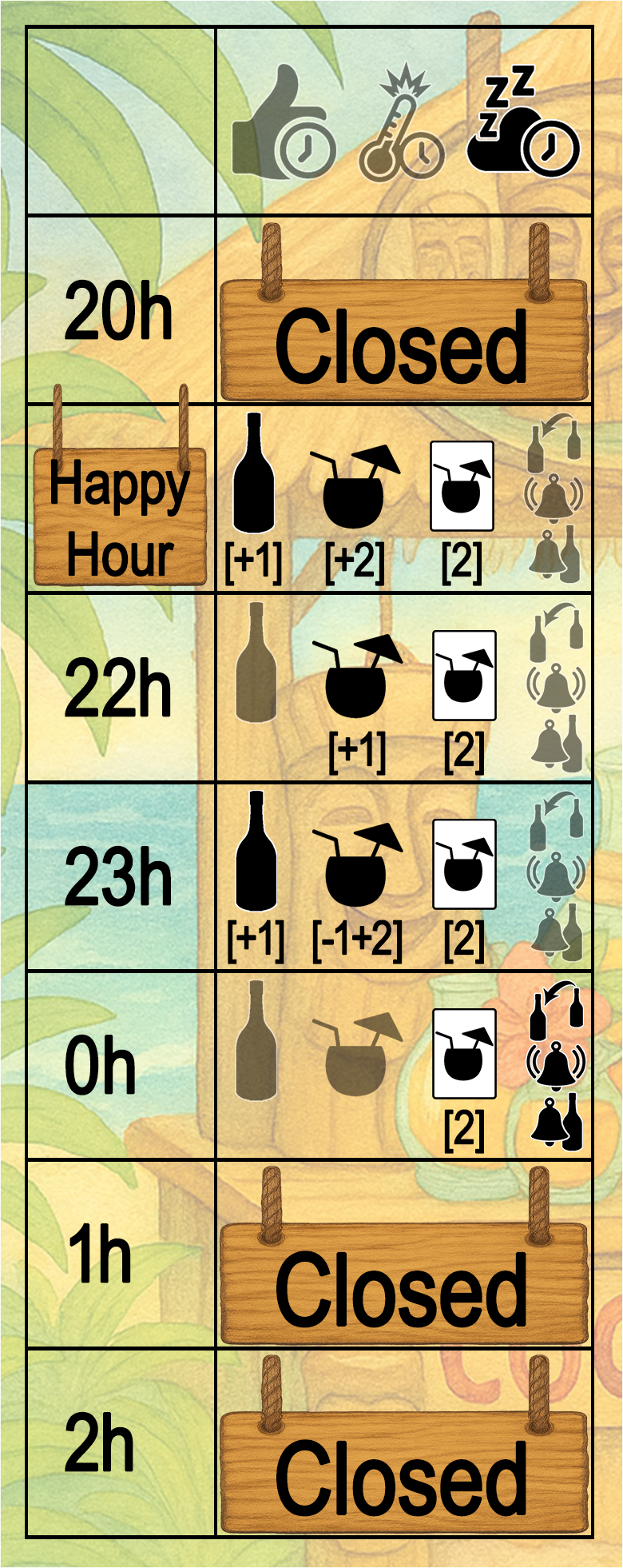 In dit spel kun je kiezen voor een ‘Single Night’ of ‘Weekend’ variant waar bij je respectievelijk 1 of 3 nachten cocktails en andere dranken aan gasten gaat serveren. Elke avond bestaat uit een aantal uur waarbij je d.m.v. ‘drafting‘ en ‘worker placement‘ probeert drank en andere ingrediΓ«nten te sparen om de bestellingen te kunnen serveren. In de weekend-variant zijn er daarnaast ook nog extra elementen van toepassing zoals training, een ‘saterday night special‘ of ‘happy hour‘.
